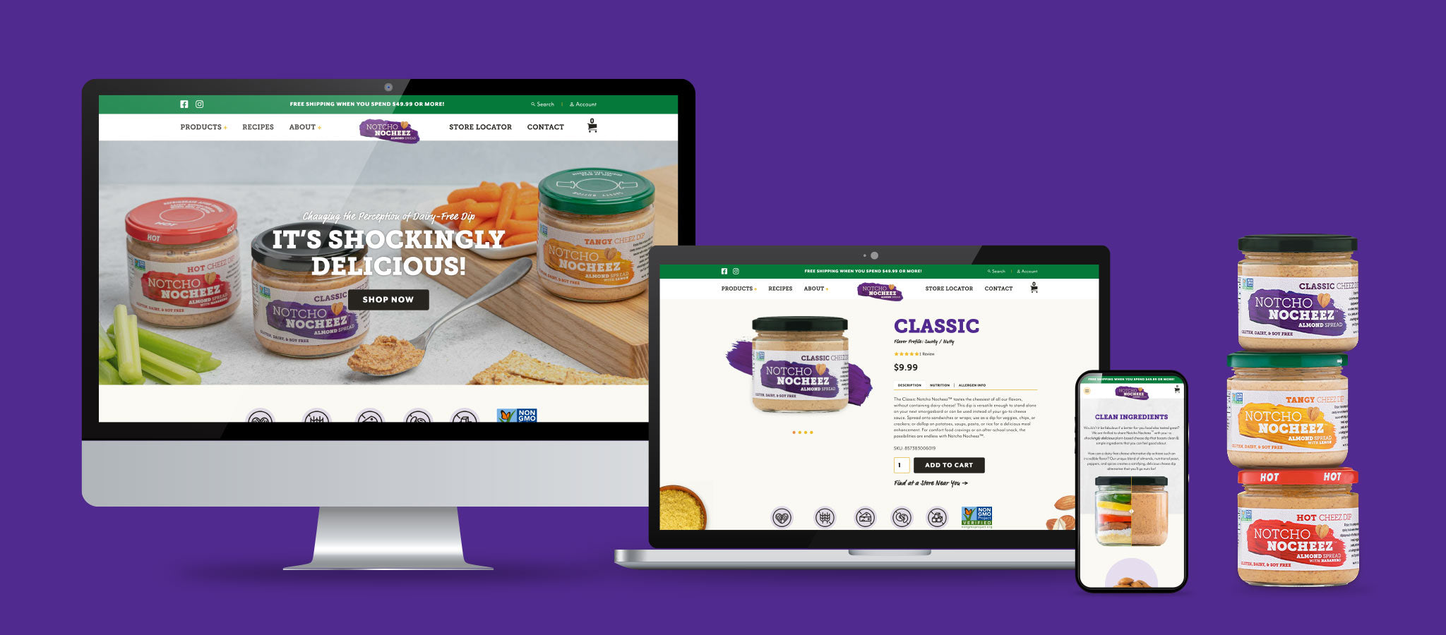 Notcho Nocheez, a plant-based alternative cheese dip made primarily with almonds, needed an updated, modern website that established an appetizing digital presence to promote brick & mortar sales and drive conversion. The new site needed to speak to their potential in the natural food space and highlight the bold personality of the brand, encouraging the WOW factor to show it’s as good – if not better – than any other dip.