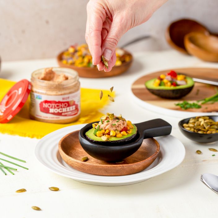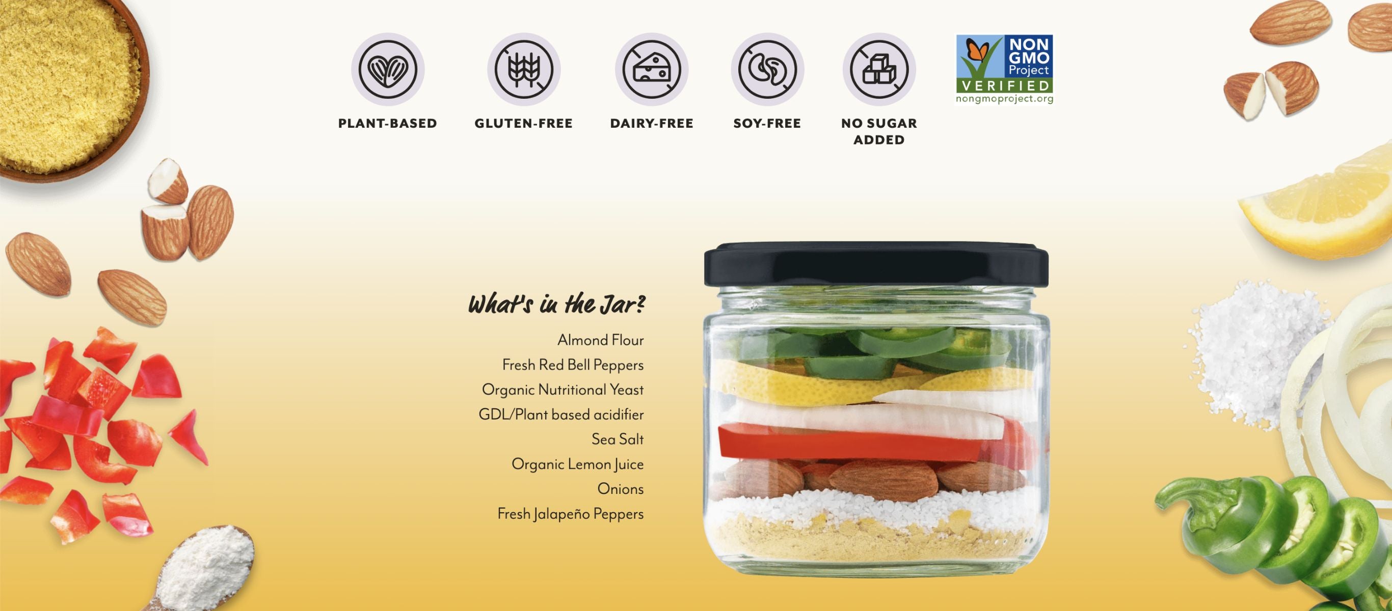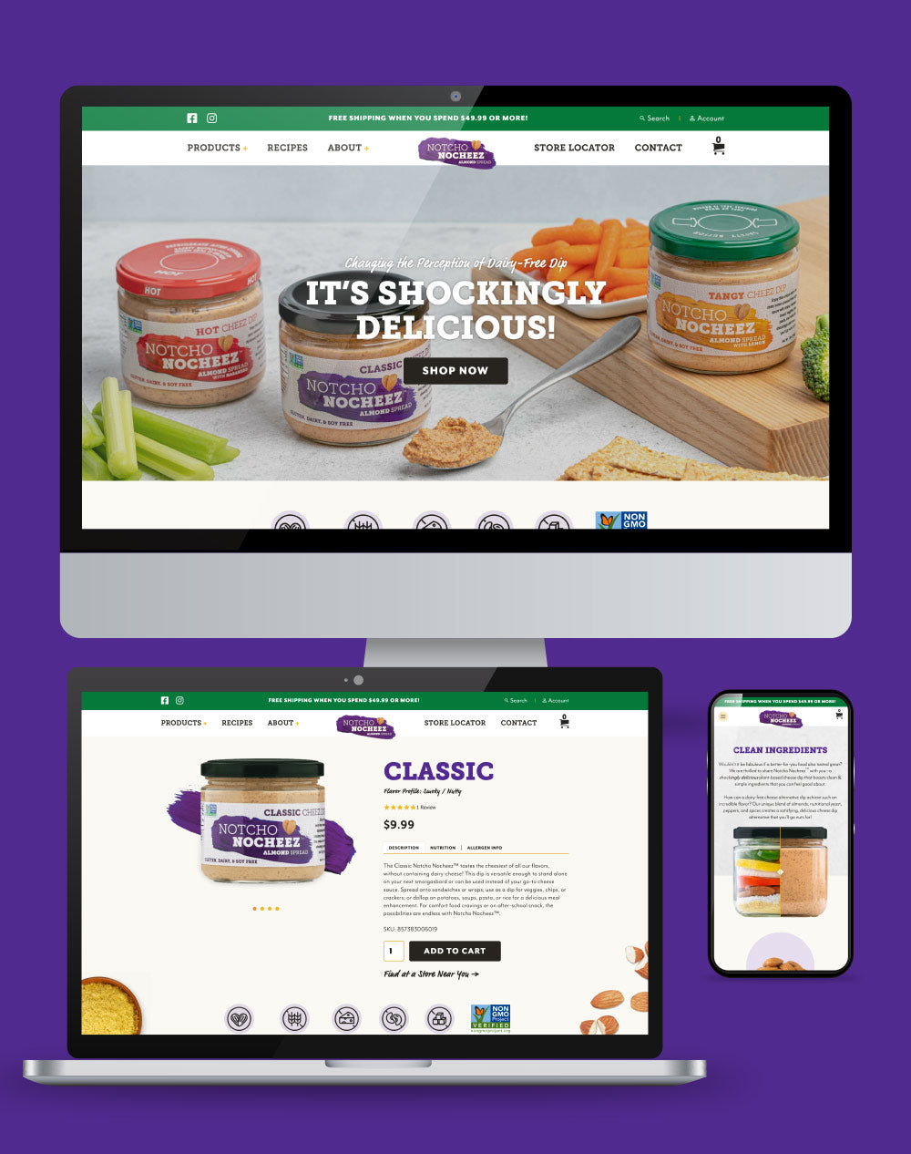 Notcho Nocheez had few assets for us to work with – except for their existing packaging – so we had a clean slate with guidance from the packaging to align the new website with. The bold flavors, simple ingredients, and the versatility of Notcho Nocheez was a huge selling point. Use it as a dip, spread, or topping for a variety of foods. Without the use of oils, dairy, or gluten, Notcho Nocheez is like nothing else in the plant-based dip category.